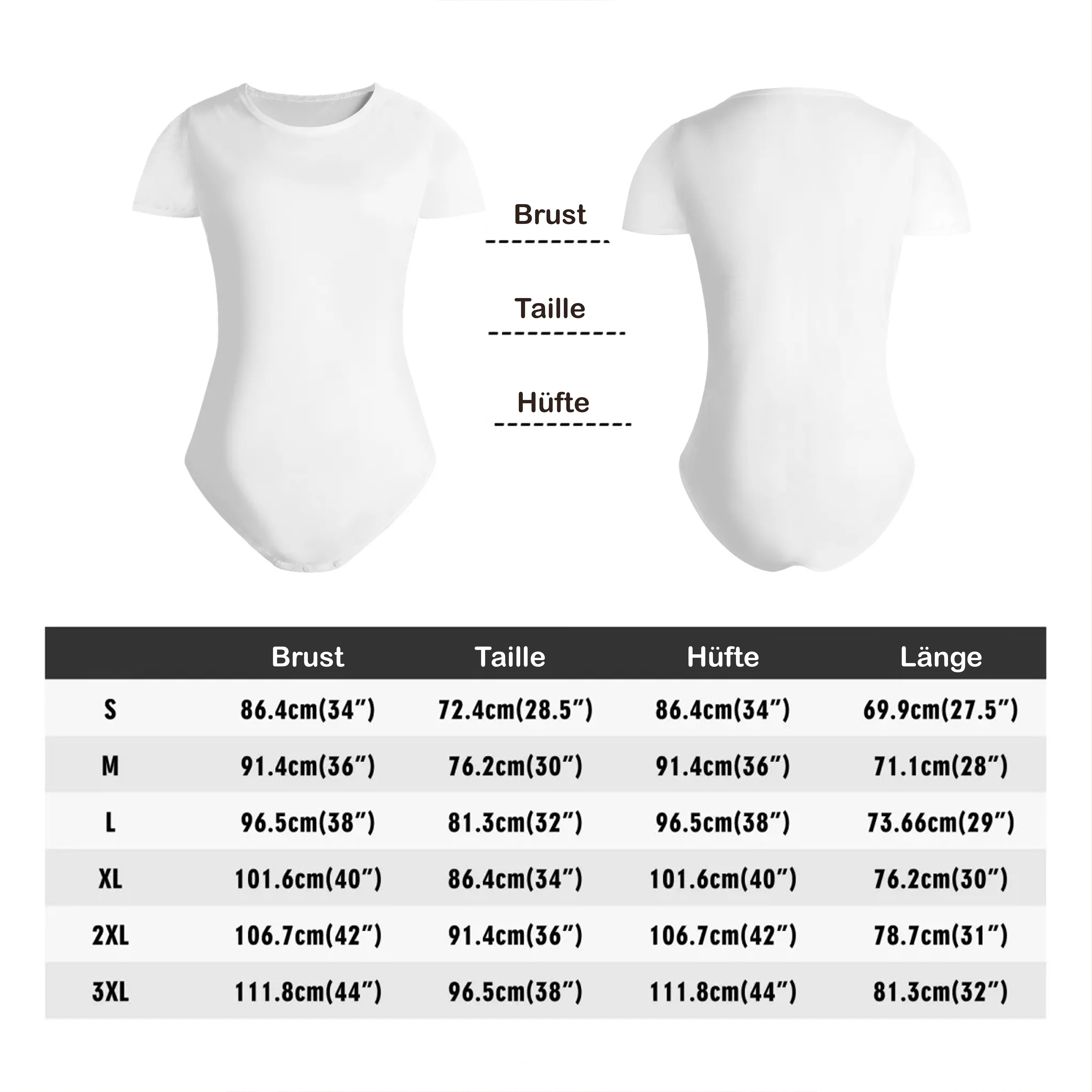 Mit seinem rundum bedruckten Design, dem leichten Stoff (180 g/m²) und den kurzen Ärmeln bist Du nicht nur bequem, sondern auch modisch unterwegs. Egal ob mit Jeans, Rock oder Shorts – dieser Bodysuit ist ein echter Allrounder und lässt sich vielseitig kombinieren.