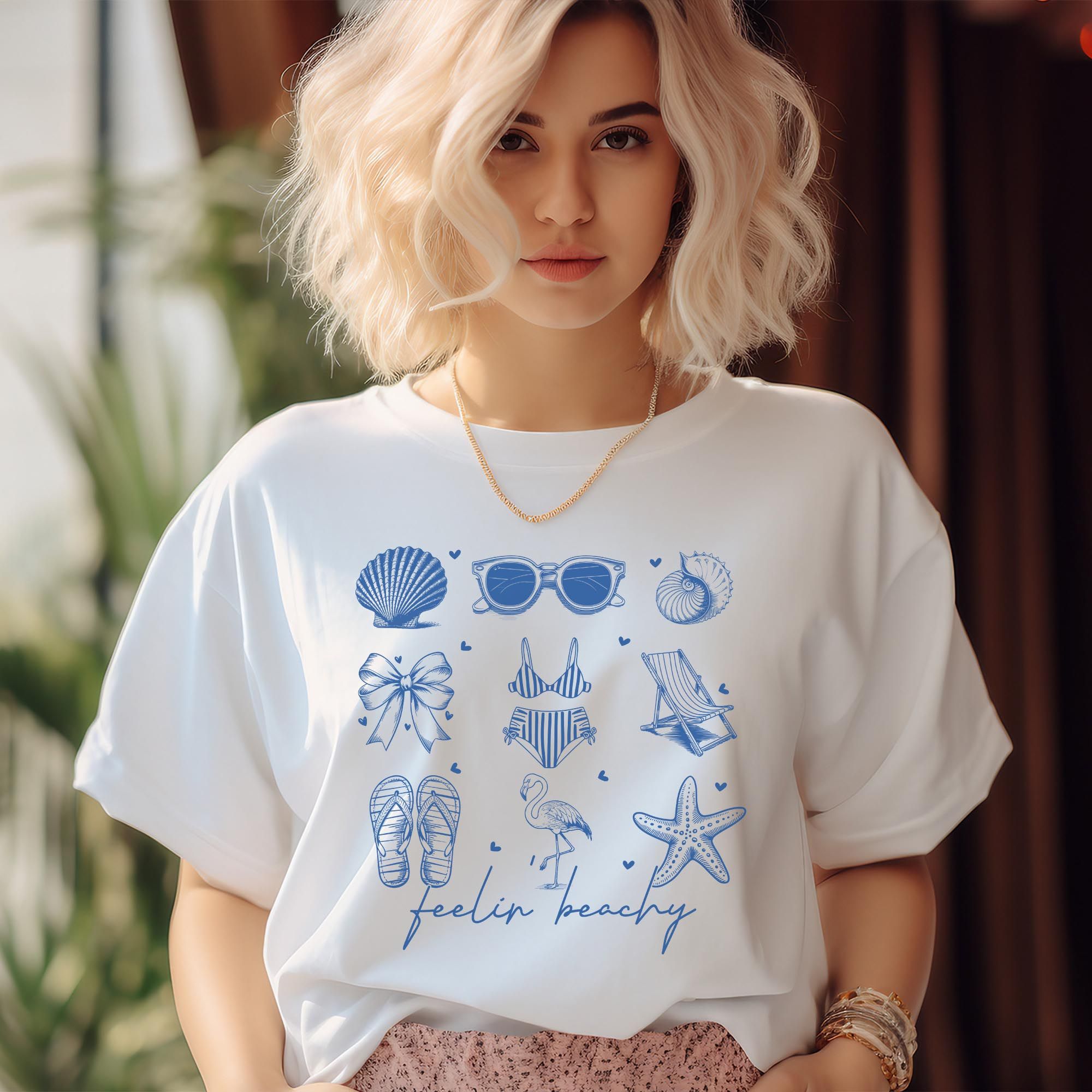 Du liebst das Meer, den Wind im Haar und barfuß im Sand zu laufen? Dann ist dieses lockere Damen-T-Shirt wie gemacht für Dich! Mit dem verspielten Schriftzug „Feeling Beachy“ und liebevollen maritimen Details bringt es Urlaubsfeeling direkt in Deinen Alltag.