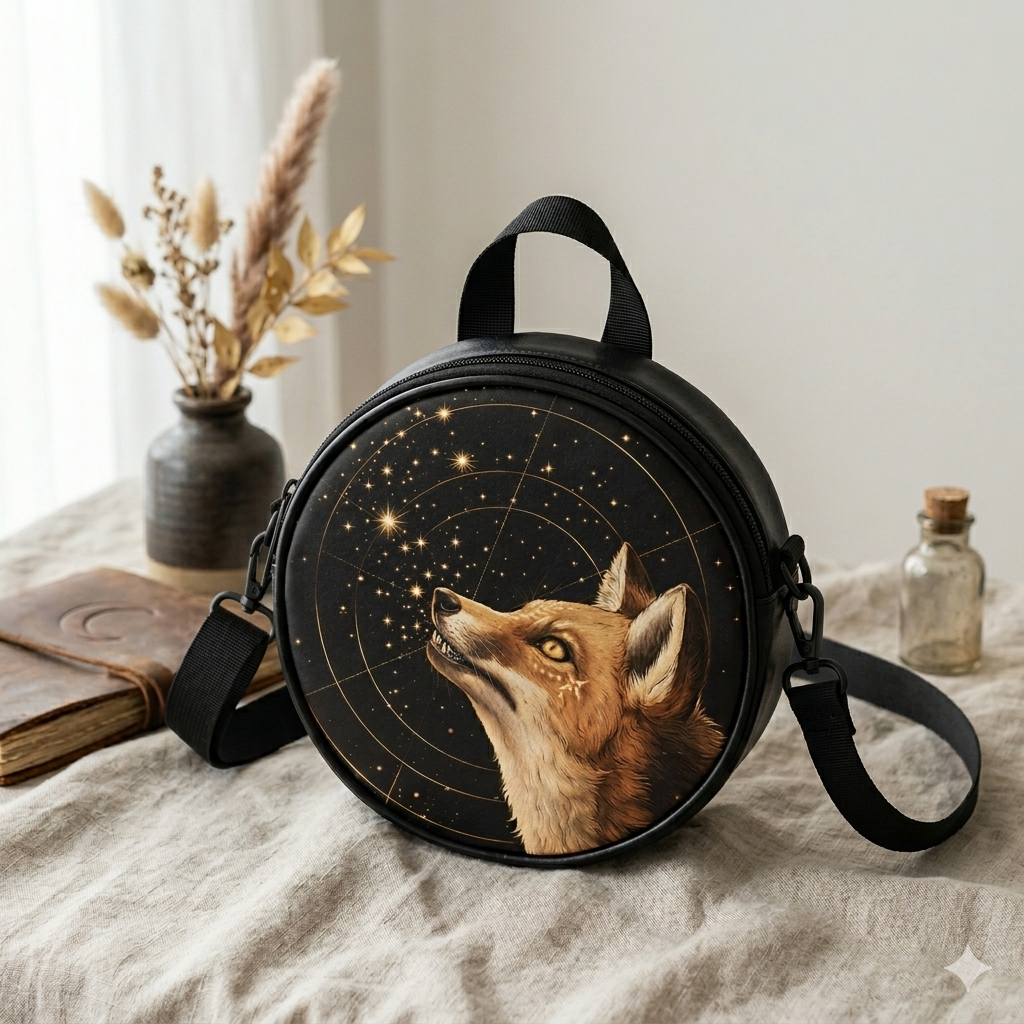 Diese Kinder‑ und Damen‑Tasche begeistert mit einem ruhigen, naturverbundenen Fuchs‑Motiv im atmosphärischen, illustrativen Stil. Der Fuchs blickt in einen funkelnden Sternenhimmel, umgeben von feinen, kreisförmigen Linien, die an kosmische Karten erinnern. Ein harmonisches, warmes Design für alle, die Tiere, Natur und mystische Ästhetik lieben.