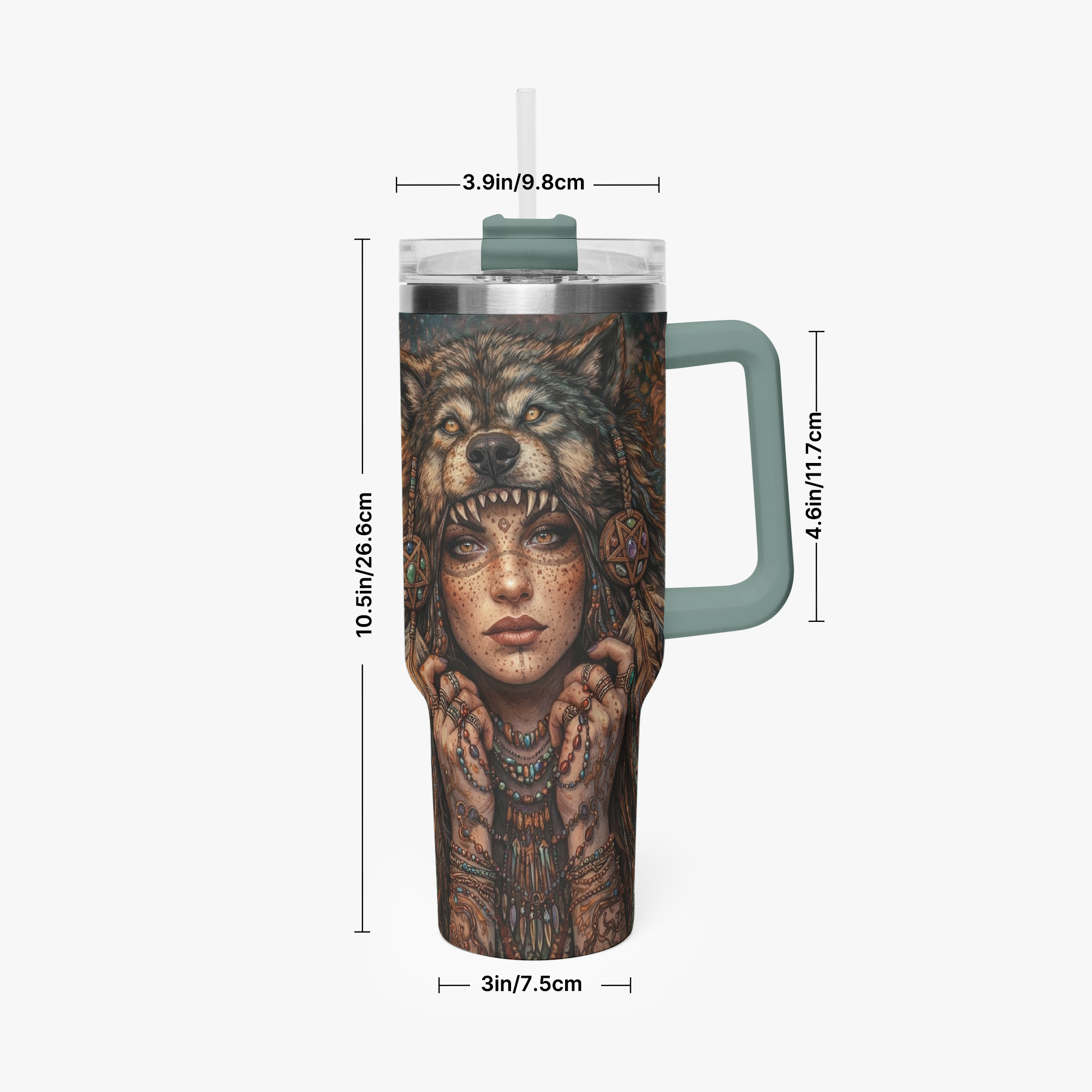 Dieser außergewöhnliche Thermobecher mit Wolf- und Kriegerin-Design ist nicht einfach nur ein Becher – er ist ein Ausdruck von Freiheit, Stärke und tiefer Verbundenheit zur Natur.