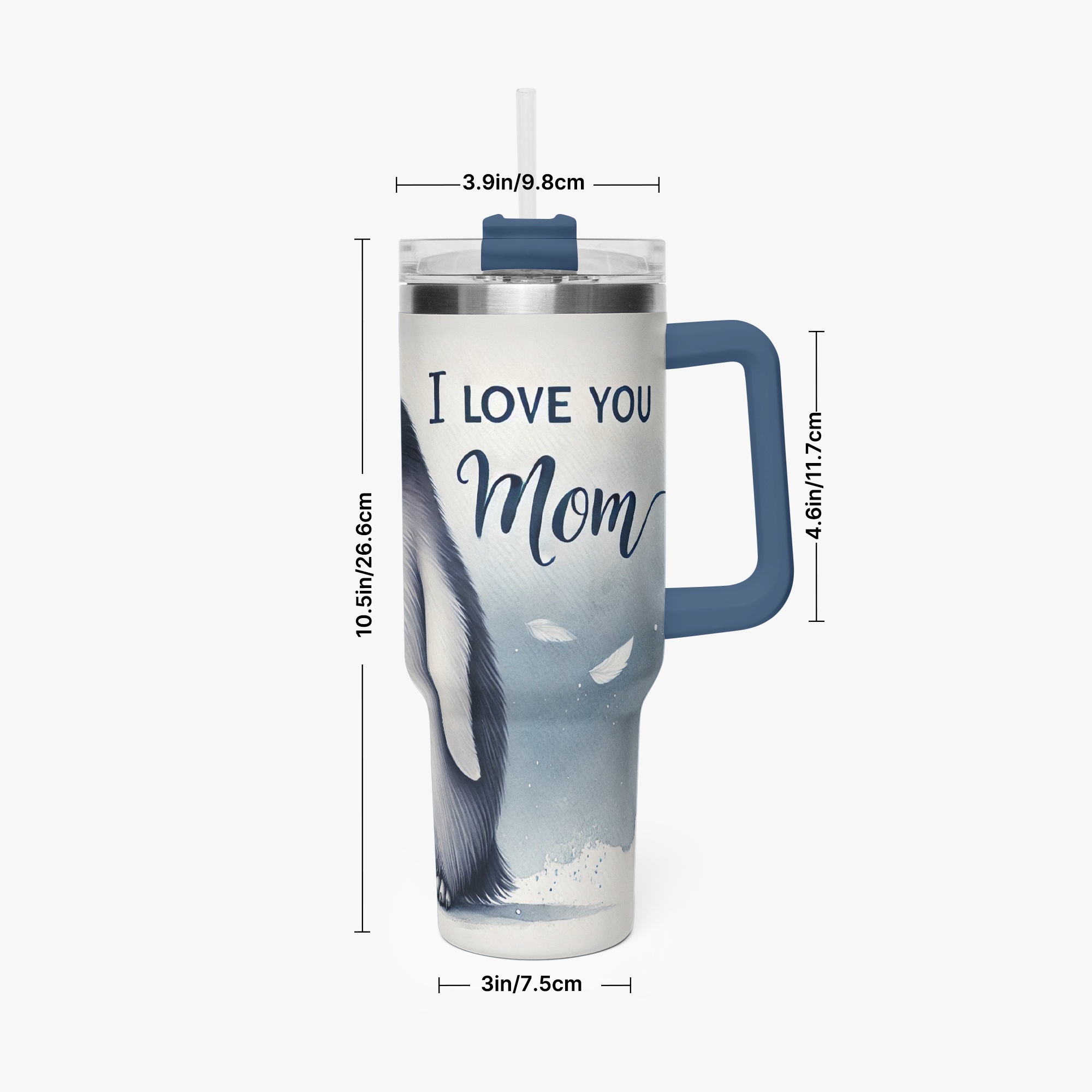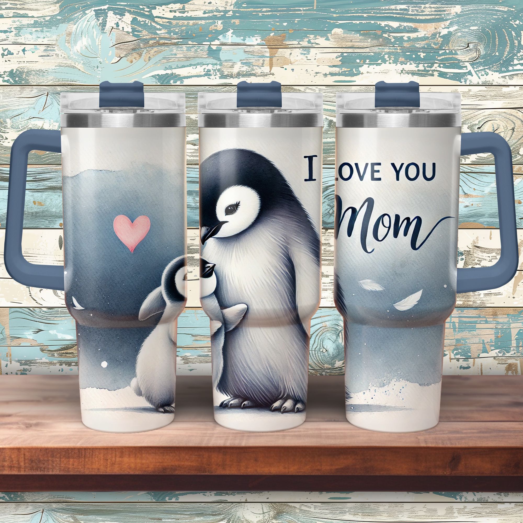 Thermobecher 40oz Edelstahl – Isolierter Kaffeebecher mit Pinguin & „I Love You Mom“ Spruch – Perfektes Geschenk für Mama
