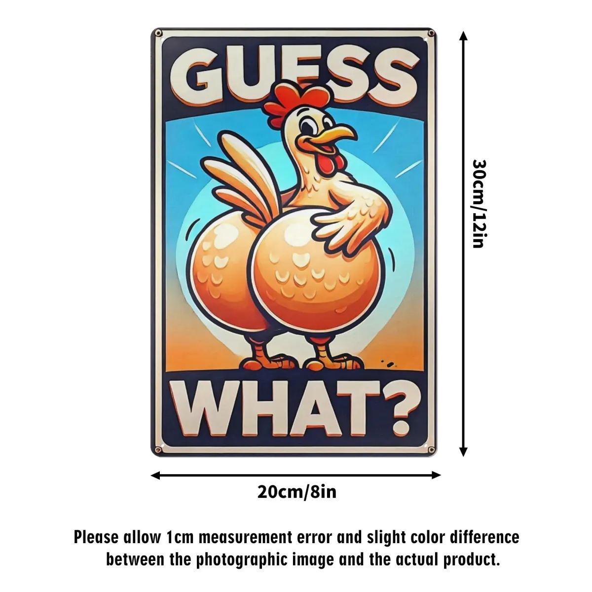 Grappig kippenblikje met de tekst "Guess What?" – Humoristische boerderijdecoratie