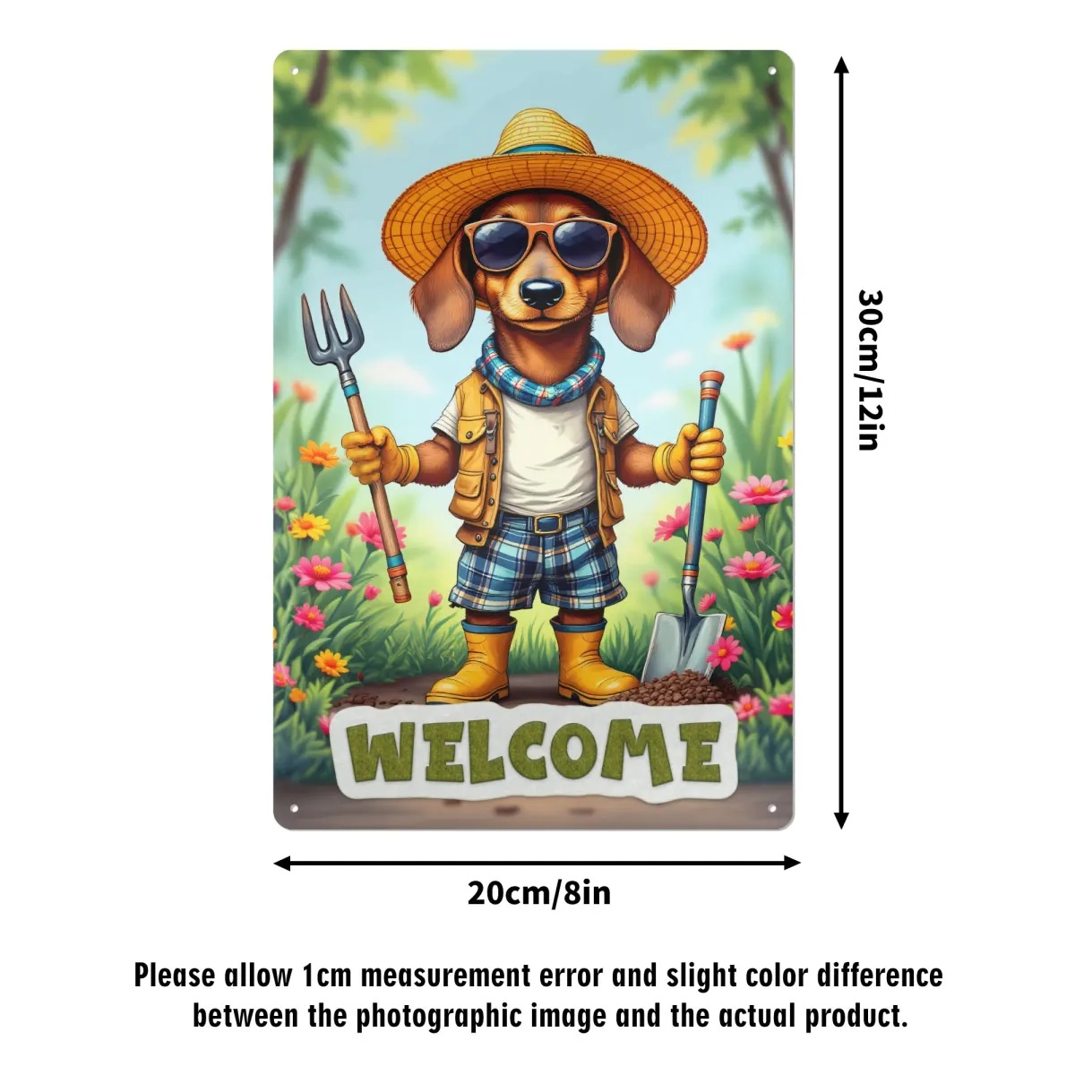 Verwelkom uw gasten met een charmant vintage tinnen bord in een liefdevol tuinman-teckel-design! Dit decoratieve bord voegt een warme en uitnodigende sfeer toe aan uw tuin, hal of balkon - perfect voor hondenliefhebbers en tuinliefhebbers!