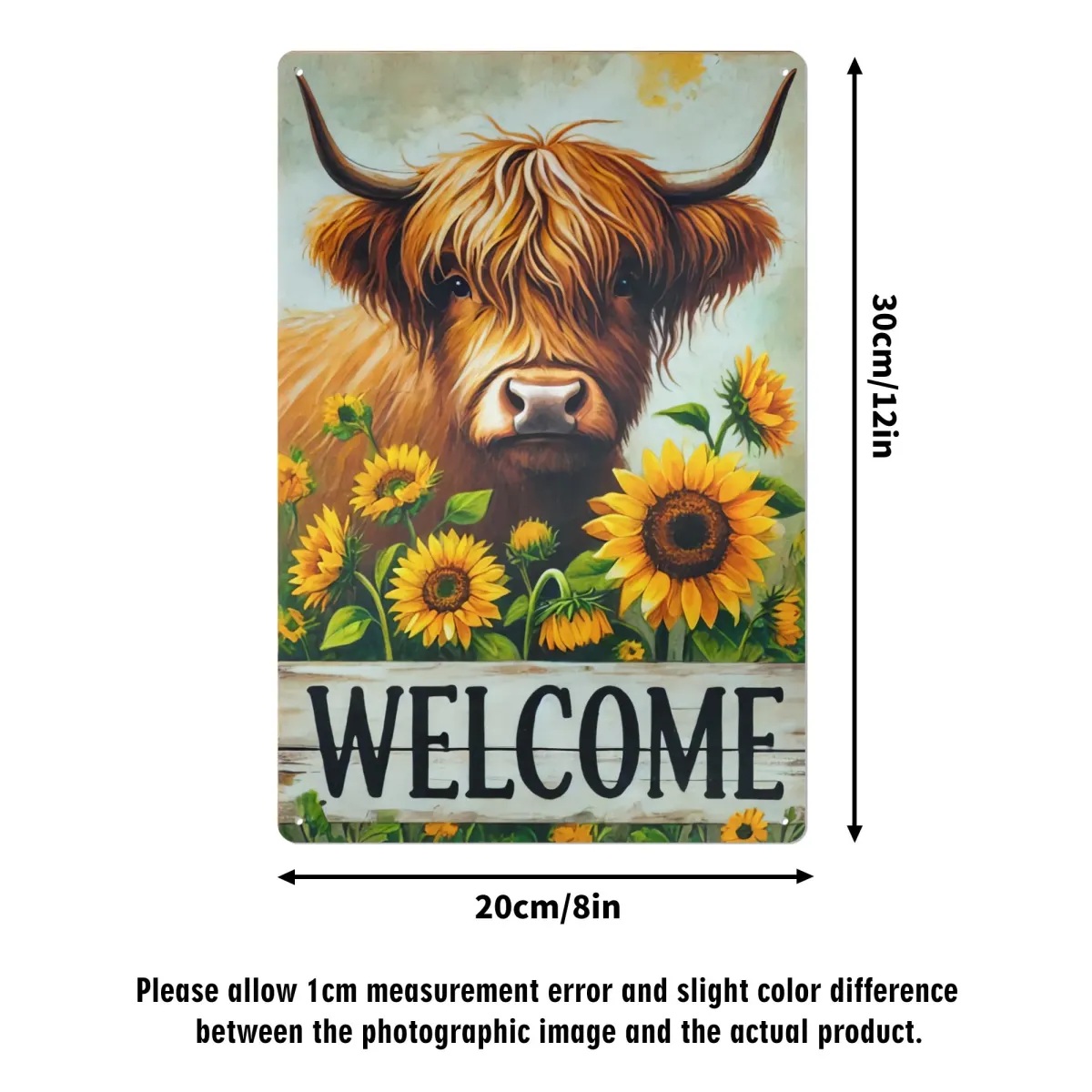 Blikken bord “Welkom” – Hooglandkoe & Zonnebloem | Rustieke decoratie voor huis en tuin