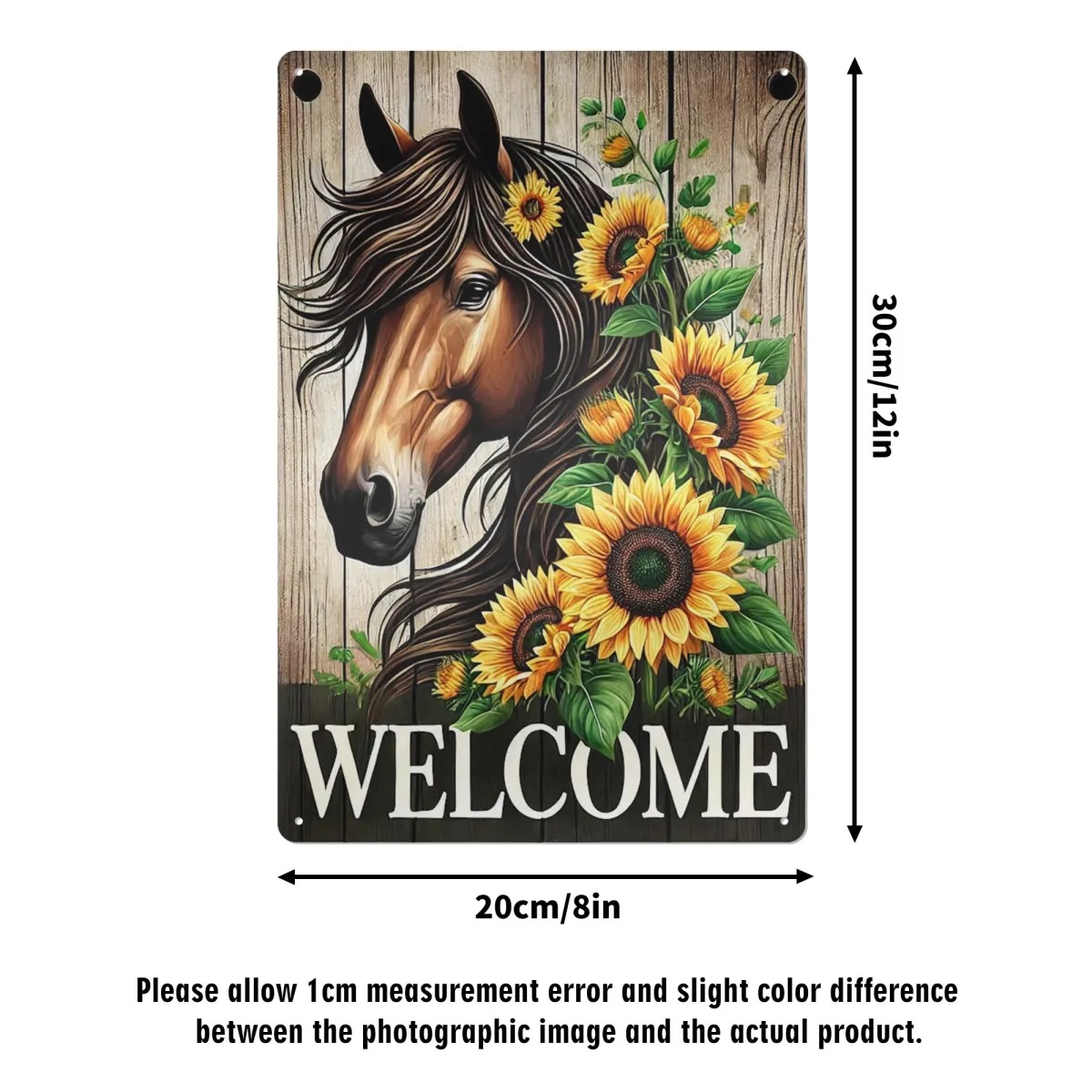 Verwelkom uw gasten met dit prachtige vintage metalen 'Welkom'-bord dat een rustieke charme aan uw huis, manege of tuin brengt! Het stijlvolle motief toont een elegant paard omringd door heldere zonnebloemen, waardoor een warme, uitnodigende sfeer ontstaat - perfect voor paardenliefhebbers, boerderijen en landhuisdecoraties.