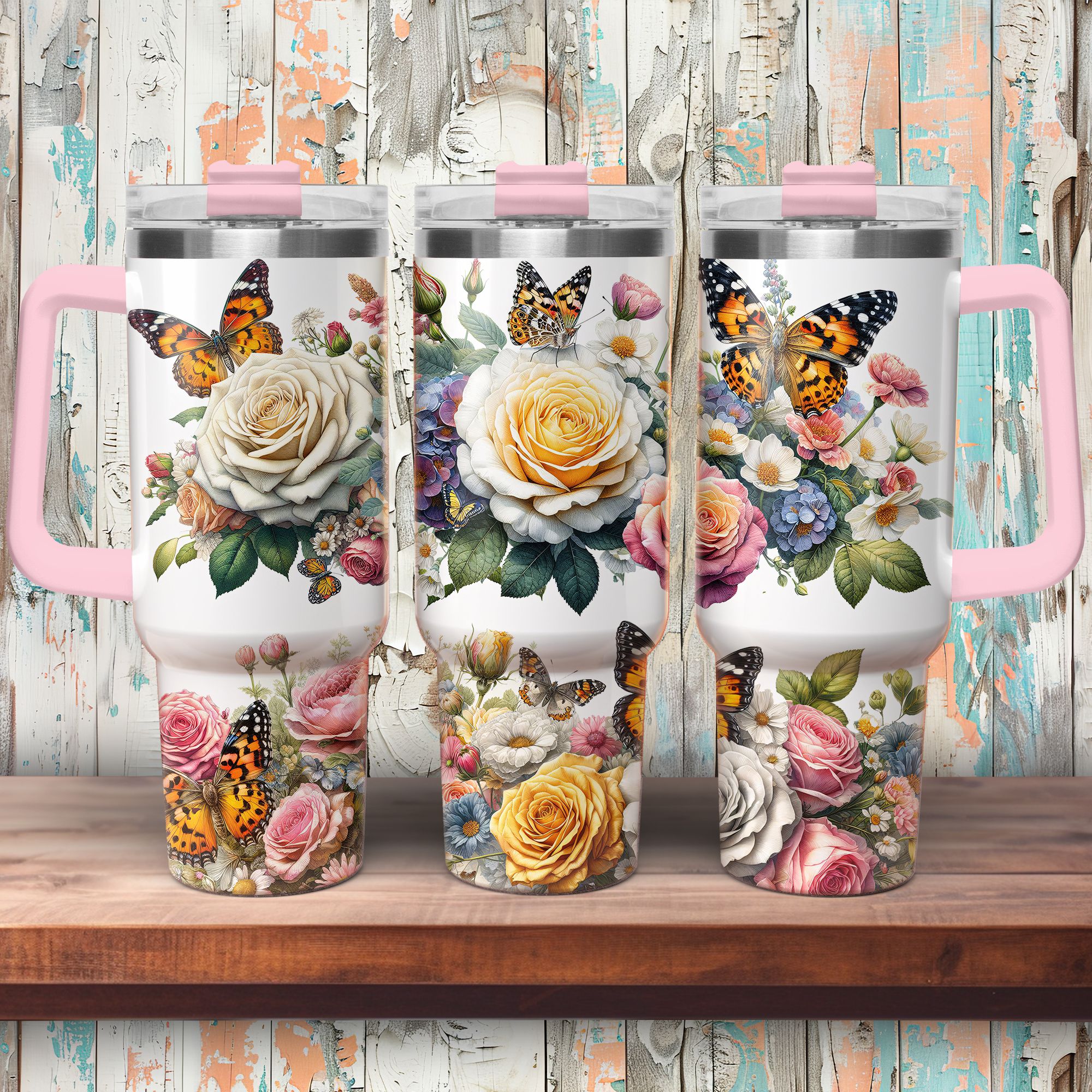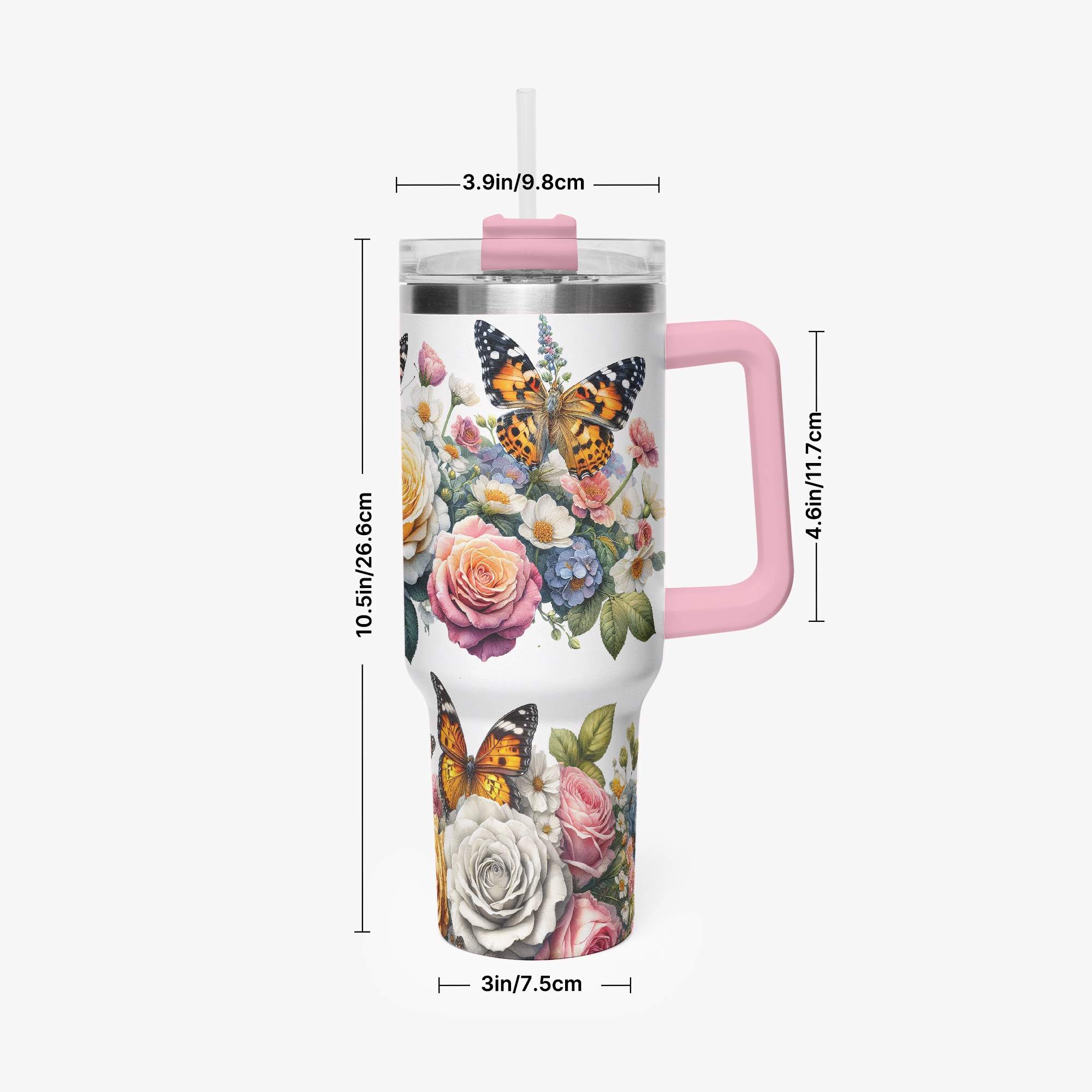 40oz thermische mok met handvat – ToGo – bloemen- en vlindermotief