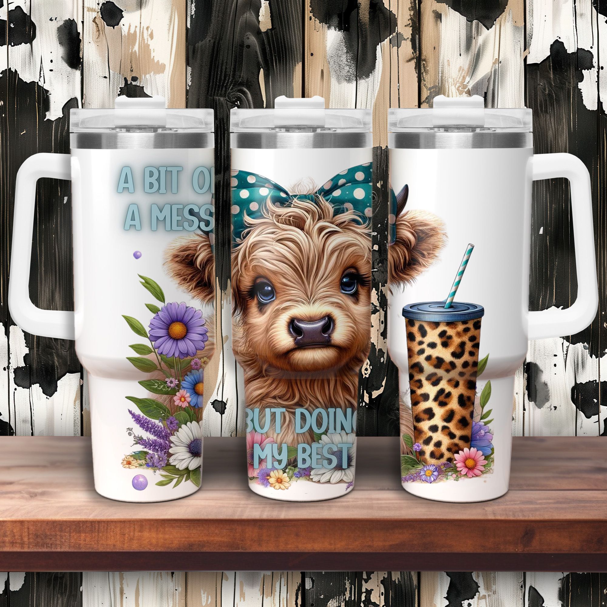 Laten we eerlijk zijn: wie voelt het niet? Deze thermische mok van 40 oz met handvat en het grappige gezegde "A Bit Of A Mess, But Doing My Best" vat precies samen wat we allemaal wel eens denken. Begeleid door een lieve Highland-koe wordt je koffie niet alleen warm, maar ook een echte sfeermaker!