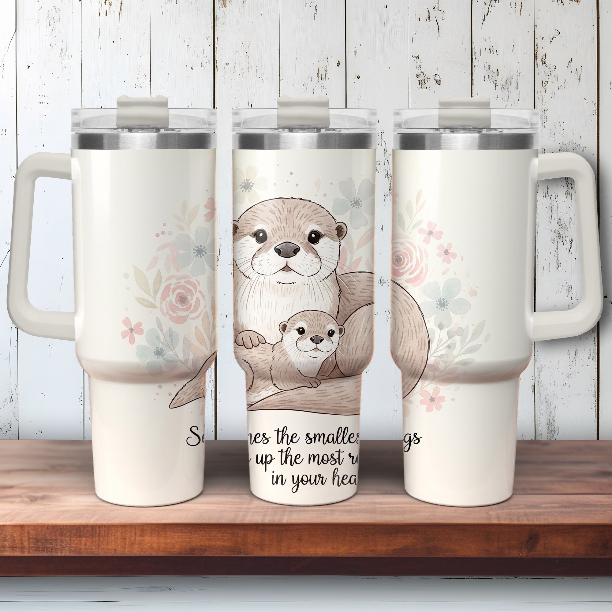 Deze betoverende thermomok is niet alleen een trouwe metgezel voor je favoriete drankjes, hij tovert ook een glimlach op je gezicht. Met een liefdevol getekend otter-moeder-kindduo en bloemendetails op een delicate achtergrond, wordt hij al snel je dagelijkse favoriet.