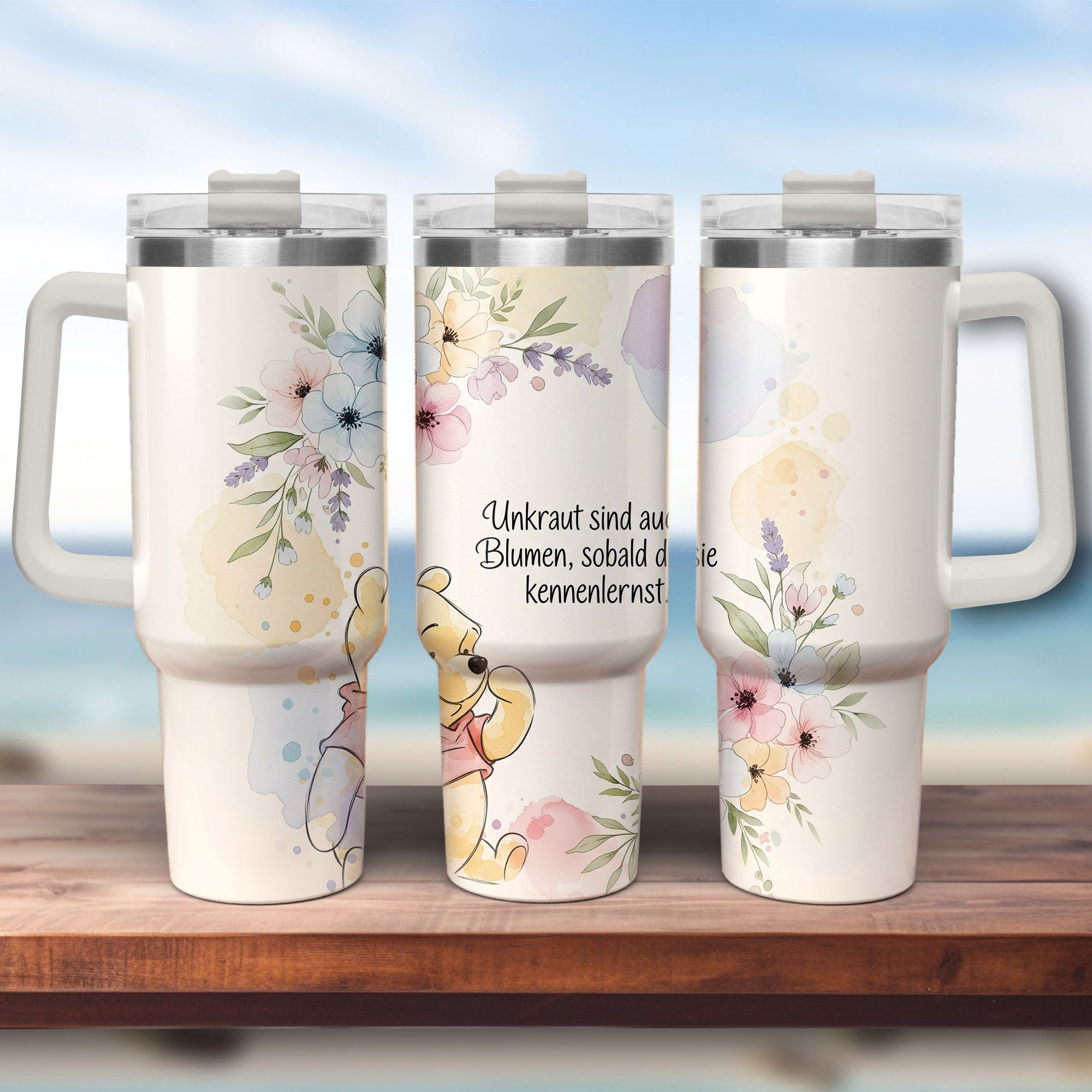 Soms heb je alleen een kleine herinnering nodig dat er in ieder mens iets moois schuilt. Deze liefdevol ontworpen thermomok met Winnie de Poeh, aquarelbloemen en een diepzinnige spreuk is meer dan zomaar een mok – het is een oprechte dagelijkse metgezel.