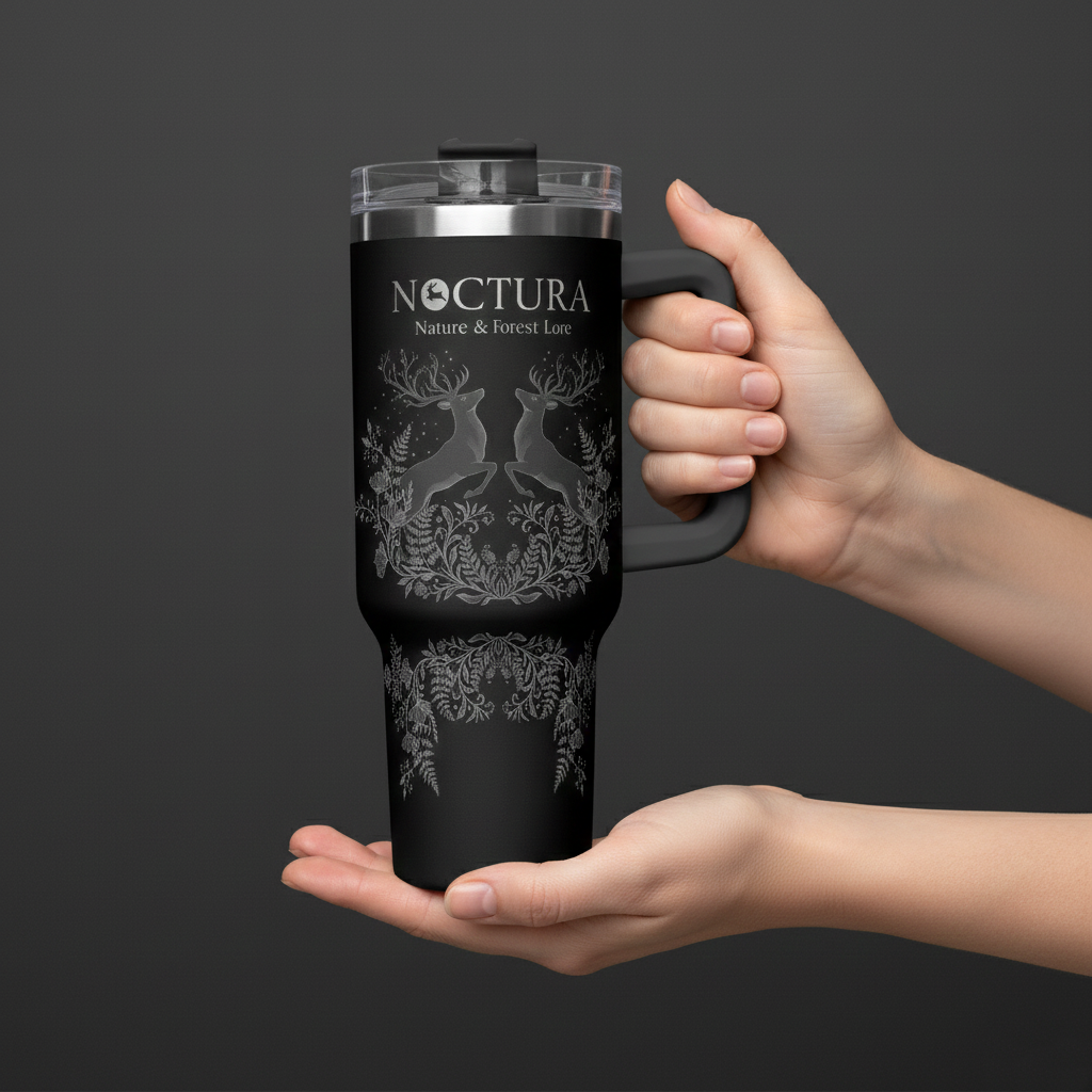Calm. Powerful. Mysterious. The NOCTURA “Silver Stag Nocturne” Travel Mug combines the majestic presence of two shimmering silver stags with delicate botanical ornaments on a deep black background. This design embodies strength, harmony, and the quiet beauty of nighttime forests – a mug that not only looks good but feels like a small moment of peace in your hectic everyday life.