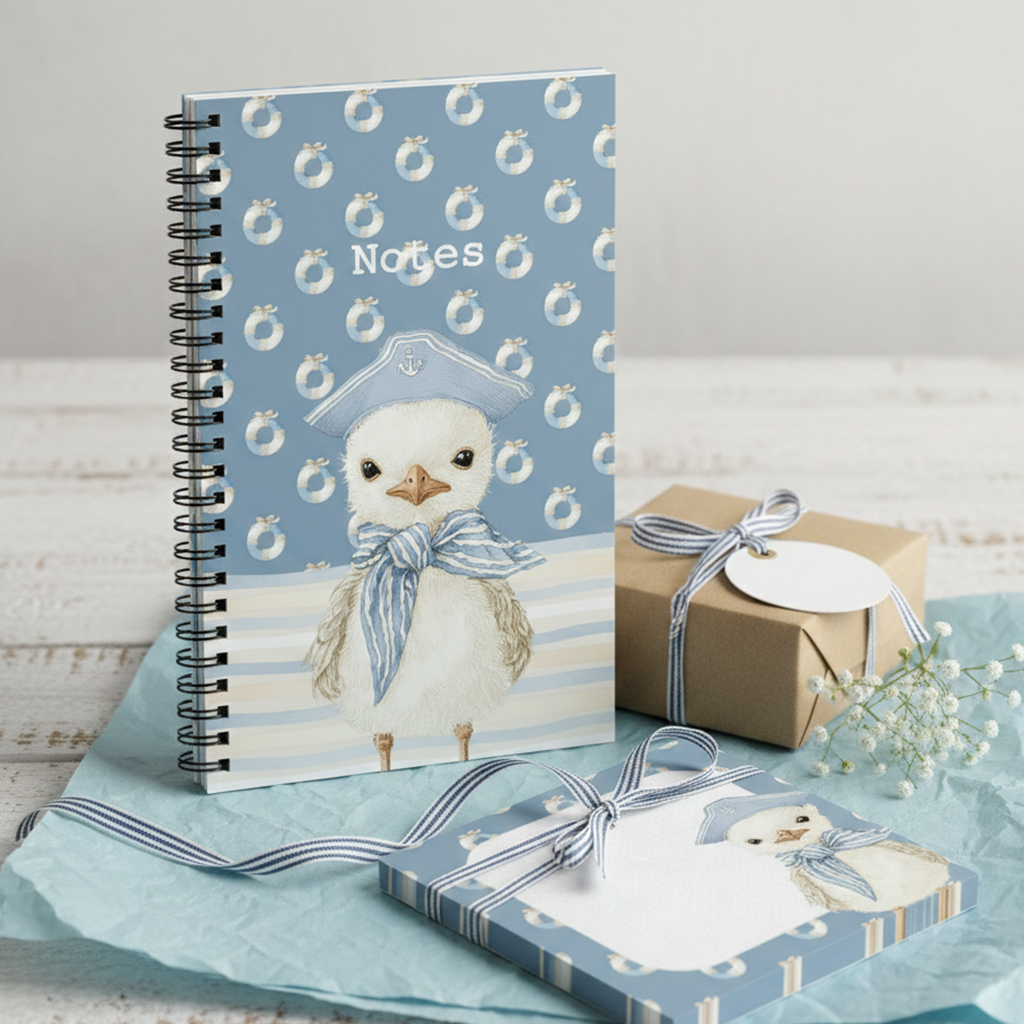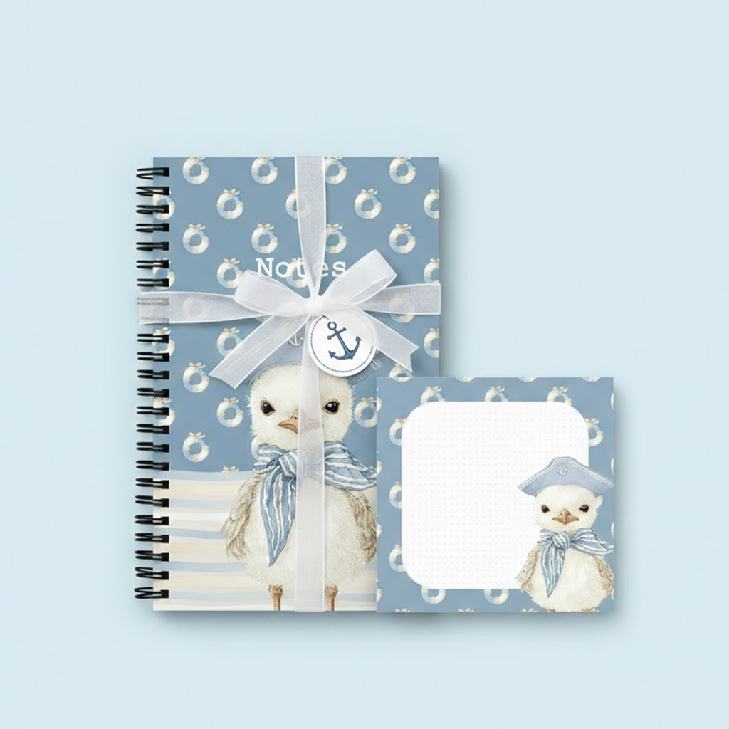 Dieses zauberhafte Spiral-Notizbuch mit niedlicher Möwe im maritimen Stil bringt frische Küstenstimmung und gute Laune in deinen Alltag. Das liebevolle Design mit Matrosenmütze, Halstuch und nautischen Details macht es zu einem echten Hingucker – perfekt für Meerliebhaber, Küstenfans und alle, die maritimes Design lieben.