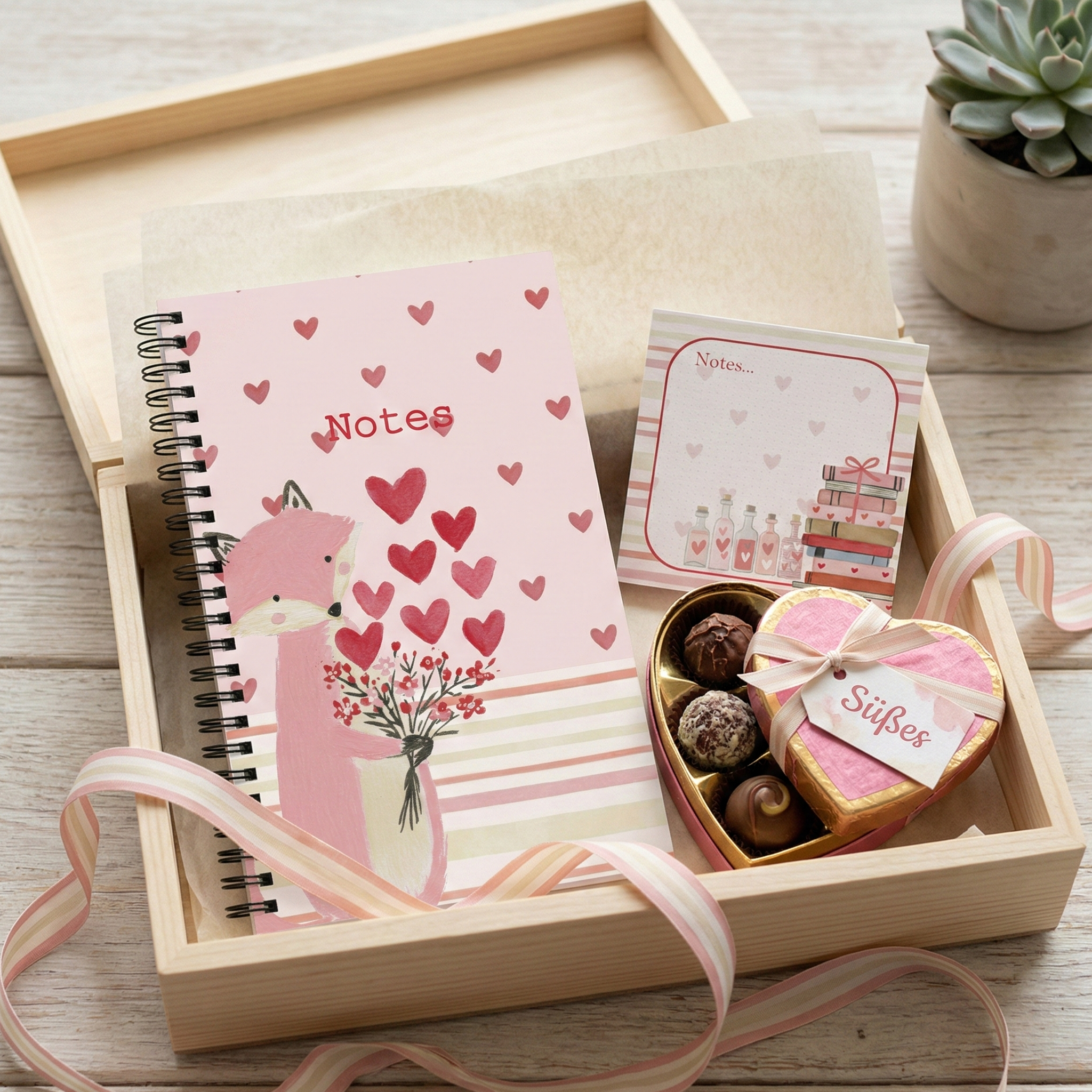 Dieses liebevoll gestaltete Spiral-Notizbuch mit süßem Fuchs, Herzmotiven und zarten Blumen steht für Wärme, Freundschaft und kleine Glücksmomente im Alltag. Die sanften Rosatöne und das verspielte Design machen es zu einem bezaubernden Blickfang – perfekt für alle, die romantische, niedliche und positive Designs lieben.