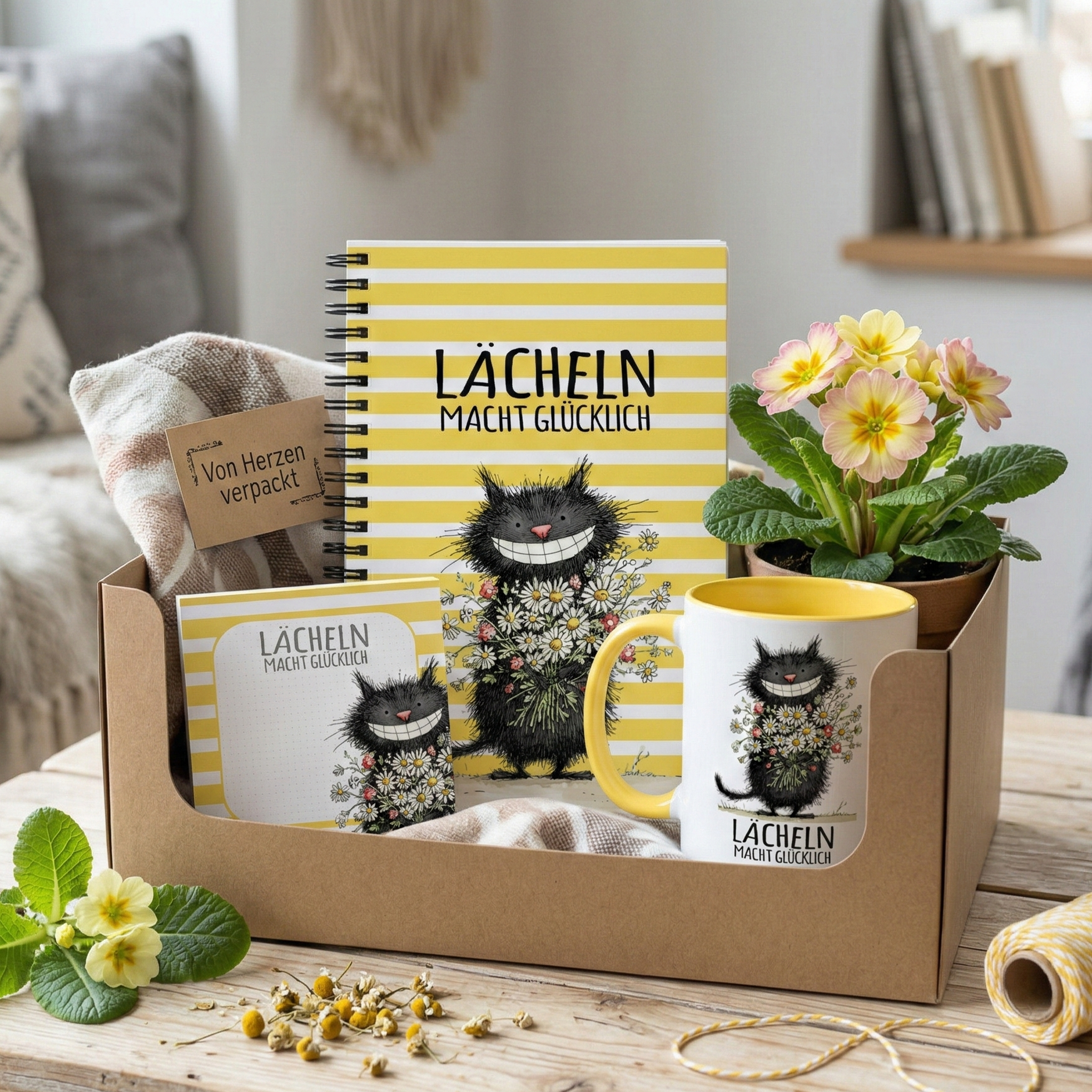 Dieses liebevoll gestaltete Spiral-Notizbuch mit fröhlichem Katzenmotiv und dem inspirierenden Schriftzug „Lächeln macht glücklich“ bringt sofort gute Laune in deinen Alltag. Die süße schwarze Katze mit Blumenstrauß auf gelb-weißen Streifen sorgt für positive Vibes, Motivation und Kreativität – perfekt für alle Katzenliebhaber und Fans von fröhlichem Design.