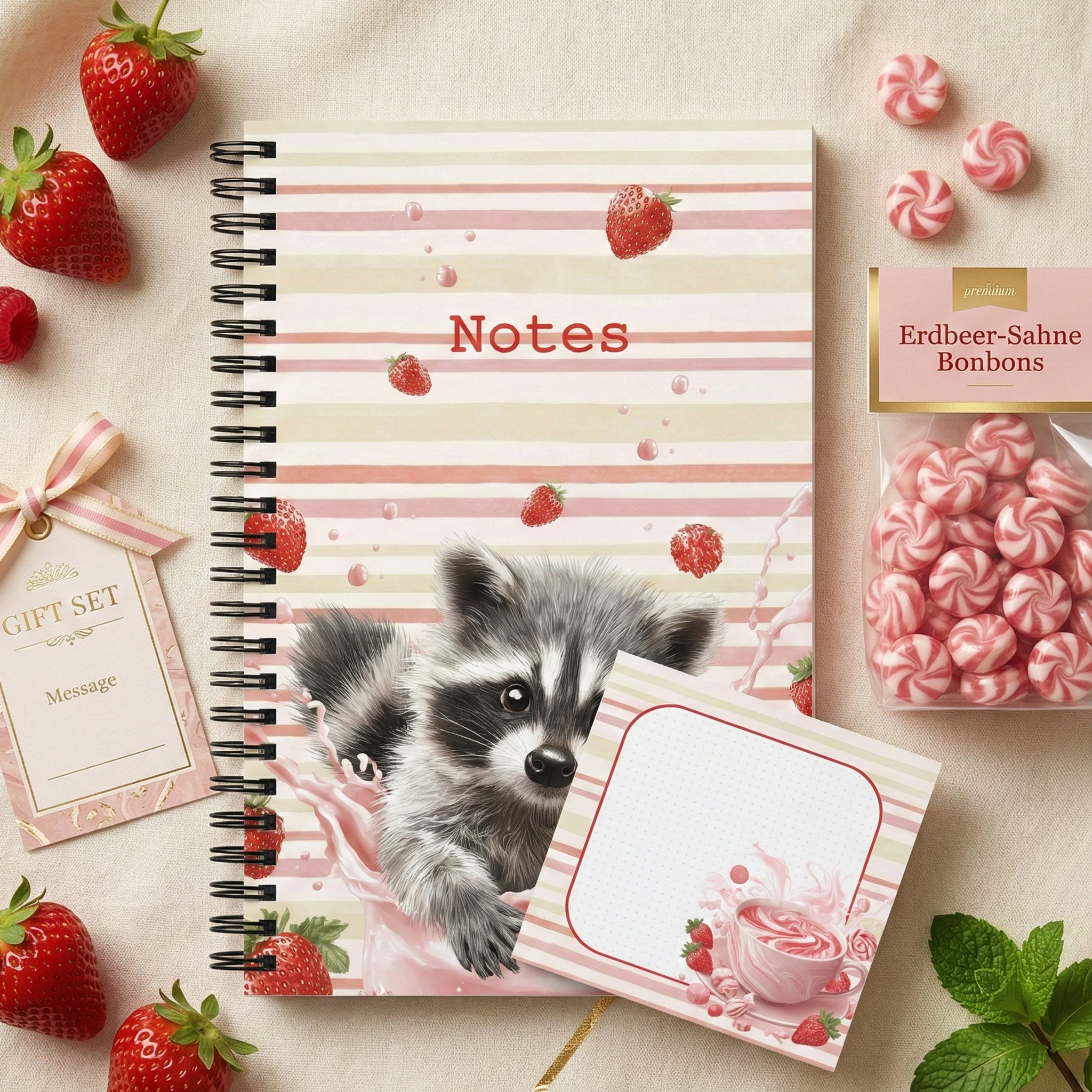 Dieses bezaubernde Spiral-Notizbuch mit niedlichem Waschbären inmitten spritziger Erdbeeren bringt Frische, Spaß und gute Laune in deinen Alltag. Das verspielte Design mit fruchtigen Details und sanften Farben macht es zu einem echten Hingucker – perfekt für Kinder, Tierliebhaber und Fans süßer, moderner Schreibwaren.