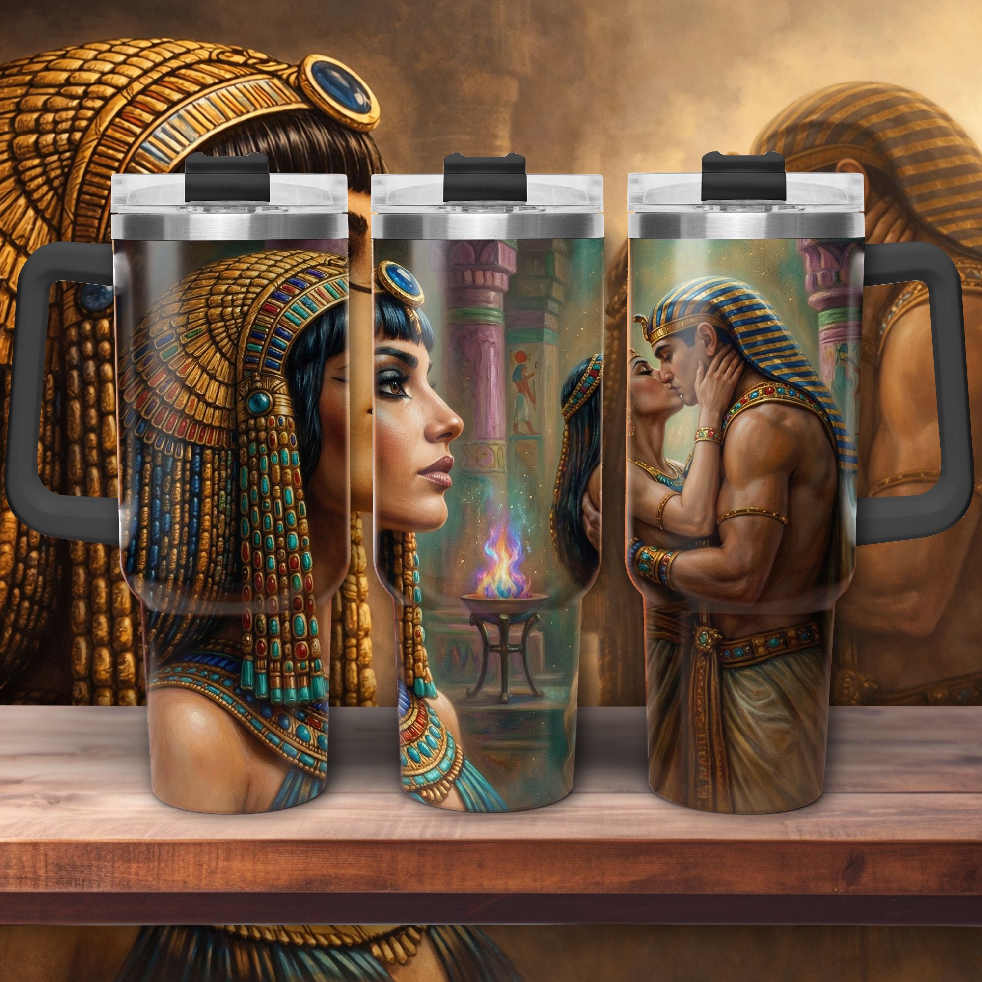 This exclusive travel mug featuring a Cleopatra couple design is more than just an everyday item – it tells a story of passion, connection, and timeless love.